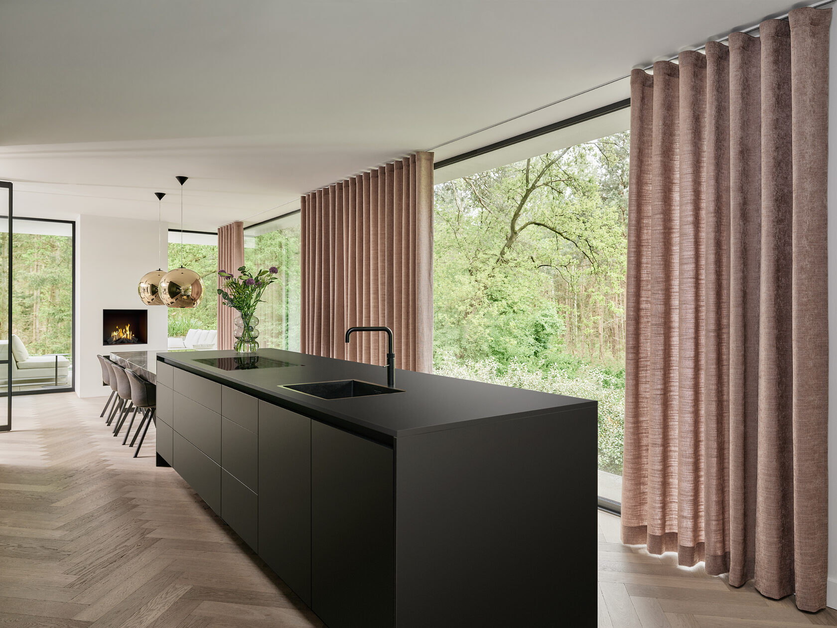 Iga päevaga lisandub üha rohkem kaasaegseid kodusid, mis hõlmavad oma disainis avatud kööki ja elutuba, kus köök saab osaks üldisest sisekujundusest. Sel kuul kujundasime avatud elutoa, kasutades uut Kobe kardemoni tooni kardina kangast, et lisada ruumi kevadist meeleolu. See pehme värv ja šenillkardina tekstuur täiendavad suurepäraselt kaasaegset köögistiili. Tulemuseks on avatud ja kutsuv ilme õrnade aktsentidega.